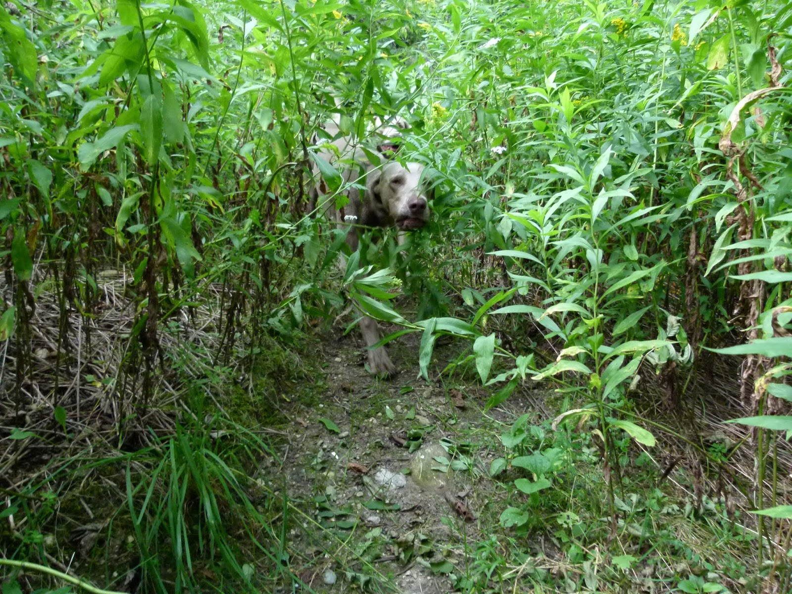 Il faut dire que Nicky pose de temps en temps son jouet pour rejoindre son frère Silver qui crapahute un peu plus loin dans la profondeur des bosquets. A son retour, il a des “Blancs” et ne se rappelle plus ou il a déposé son jouet. Si, je ne fais pas attention pour contrôler ou, Nicky dépose son jouet alors, je ne peux plus l’aider à le retrouver. Peut-être que ça fera le “Bonheur” d’un renard ou d’un autre chien.