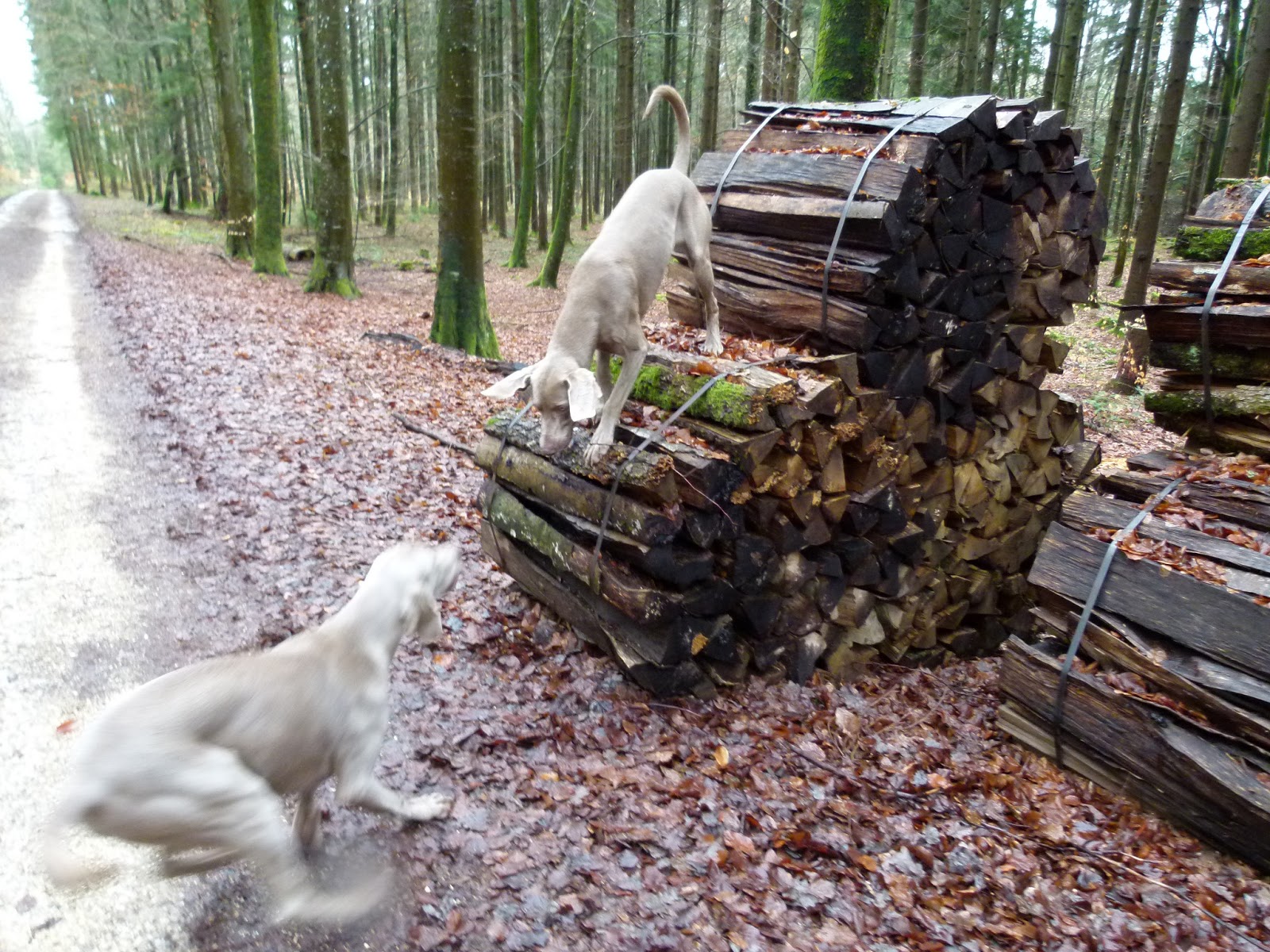 Hello! Cette nuit, il y a eu un monstre orage, j’ai cru qu’avec le tonnerre, les vitres allaient explosées. En tout cas, Nicky et Silver n’ont pas été perturbé. Enfin, ce matin, c’est à nouveau un temps gris et,avec un peu de pluie. Malgré la “Bise” il y fait quand même un peu plus chaud 8°. Ont arrivent dans la forêt de Yens à 9h°°. Une voiture se parque 300m plus bas, mais, nous nous mettons en route. Quelques minutes plus tard, une dame fusée (avec son pantalon) nous dépasse à la vitesse grand V. C’est normal, elle fait de la marche Nordic. Les chiens ne s’en préoccupe pas et continue d’explorer les alentours. Lorsque je voie ces stères de bois, je ne peux n’empêcher de faire faire un exercice de recherche à Nicky et Silver. Durant toute la promenade, j’ai fait effectué plusieurs recherche à Nicky car, j’ai remarqué qu’il était en forme.