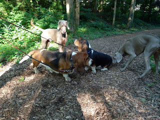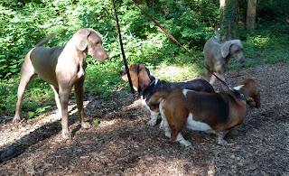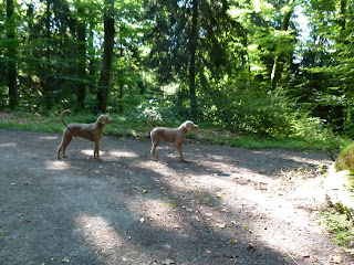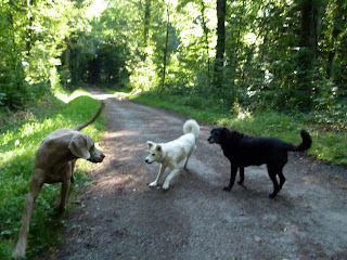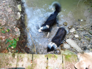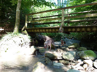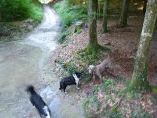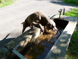 Cet après midi, la balade a été effectuée juste en dessous de notre niche soit dans la campagne de Lussy et la forêt de Lully. Température estivale de 30° donc les chiens ont été faire une baignade. Nous avons rencontrée en tout premier une Border Coolie. Dés qu’elle nous a vu, elle est repartie en arrière et, nous l’avons suivi car, nous effectuons le même parcours mais, à l’envers. Je savais à qui cette chienne appartenait car, ont se croisent 1 à 2 fois par semaine. Arrivée à la hauteur de sa maîtresse et de ces 2 autres compagnes, nous avons échangées quelques mots de chiens. La dame qui a cette Border m’a dit “Que sa chienne a 2 ans et qu’avant elle, les autres Border quelle a eu ne partait pas si loin en avant” Je lui ai répondu: C’est normal elle est comme les dames depuis qu’elles sont devenues indépendantes, elles font ce quelles veux” Pas mal…. la réplique….. Plus tard, nous avons croisé une BA de 2 ans. Au début lorsqu’elle a vu mes des lascars, elle était craintive. Sa maitresse lui a dit “Va jouer” et, là elle a compris le B.A.BA de l’ordre et, elle s’est mise à jouer avec Nicky durant 2 bonnes minutes. Le nom de cette chienne Laska. Ensuite de cela, nous avons repris notre chemin pour nous rendre à nouveau dans le ruisseau afin de se rafraichir et, rejoindre la voiture pour la rentrée. Nicky et Silver ont encore profité de faire près d’un km en courant “Non Stop” Maintenant, ils sont OUT dans leur panier.