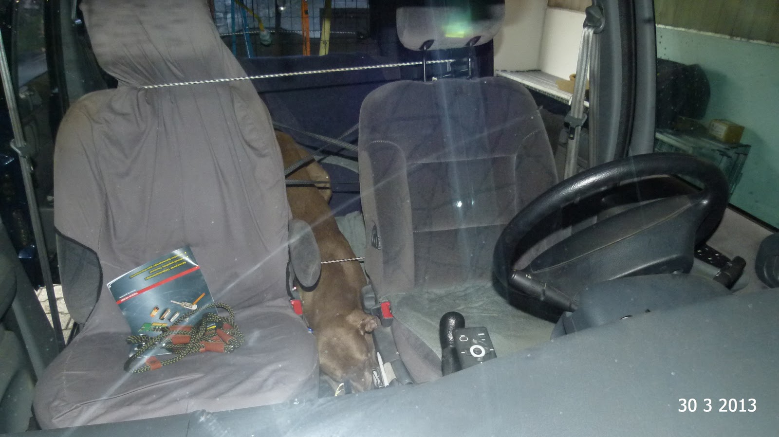 Comme vous pouvez le constater, le but de l’exercice est d’aller chercher la clé de la maison qui se trouve entre les 2 sièges avant. En plus, la difficulté est qu’il y a un barrage élasticités pour l’empêcher de passer à l’avant lorsque je conduit. Nicky a déjà tenté de faire mon copilote. Surtout depuis que la Tchoune est partie au paradis des chiens.
