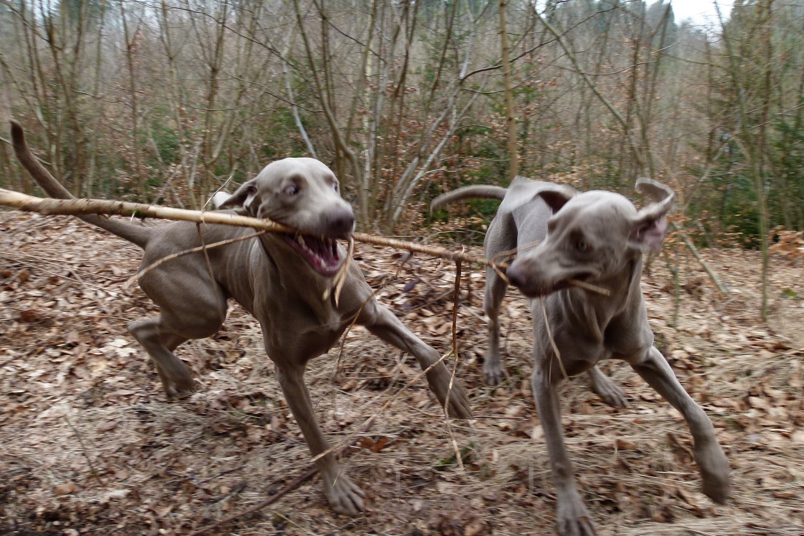 Je trouve vraiment triste pour des chiens qui en principe ont besoin de se défouler de toujours les avoirs tenu en laisse. Pour Nicky et Silver, il me serrait impossible d’accepter ce genre de situation. Ce sont des chiens qui font en tout 2 à 4 fois plus de parcourt qu moi. Ils se défoule vraiment lorsqu’ils sont sans laisse. Et, tonnerre, pourquoi ne pas leur faire confiance. Même si, ils s’échappent au début de leur première promenade. Cela ne veut pas dire qu’ils le feront systématiquement et à chaque fois. Nicky et Silver se sont échappés 2 ou 3 fois, je ne les ai jamais rappelé et, lorsque qu’enfin nous nous sommes retrouvés c’était pour nous sauter dans les bras. Je veux vous dire que Nicky a toujours l’œil sur moi, dès que je me cache ou que je change sans prévenir de chemin dans les 30 sec. qui suit mes 2 loustics sont à nouveau vers moi. Il y a aussi le fait, que fréquemment, je profite de leur absence pour cacher une friandise, un objet ou un bout de truffe et, dès leur retour, ils se mettent à sniffer à fond pour retrouver la chose qui a été cachée. ça, ils adorent ce genre d’exercice et, ça fait marcher leur flair. Pour tout vous dire, je constate que mes 2 braques sont vraiment fantastique. Ils ne cherche vraiment pas à chasser et, dès que je remarque qu’ils se mettent à l’arrêt pour sentir un gibier, je leur dit simplement “On n’y vas” et, ils oublient et reprennent leur chemin. J’ai moins de problème avec eux qu’avec les 4 Goldens que j’avais auparavant. C’est vraiment un immense plaisir d’avoir ces 2 loustics et, de les voir courir c’est vraiment magnifique.