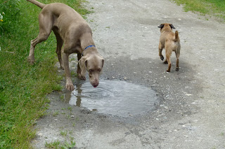 Indy prenant un bain d’eau stagnante pour se rafraichir. Jouer avec Nicky ça épuise énormément.