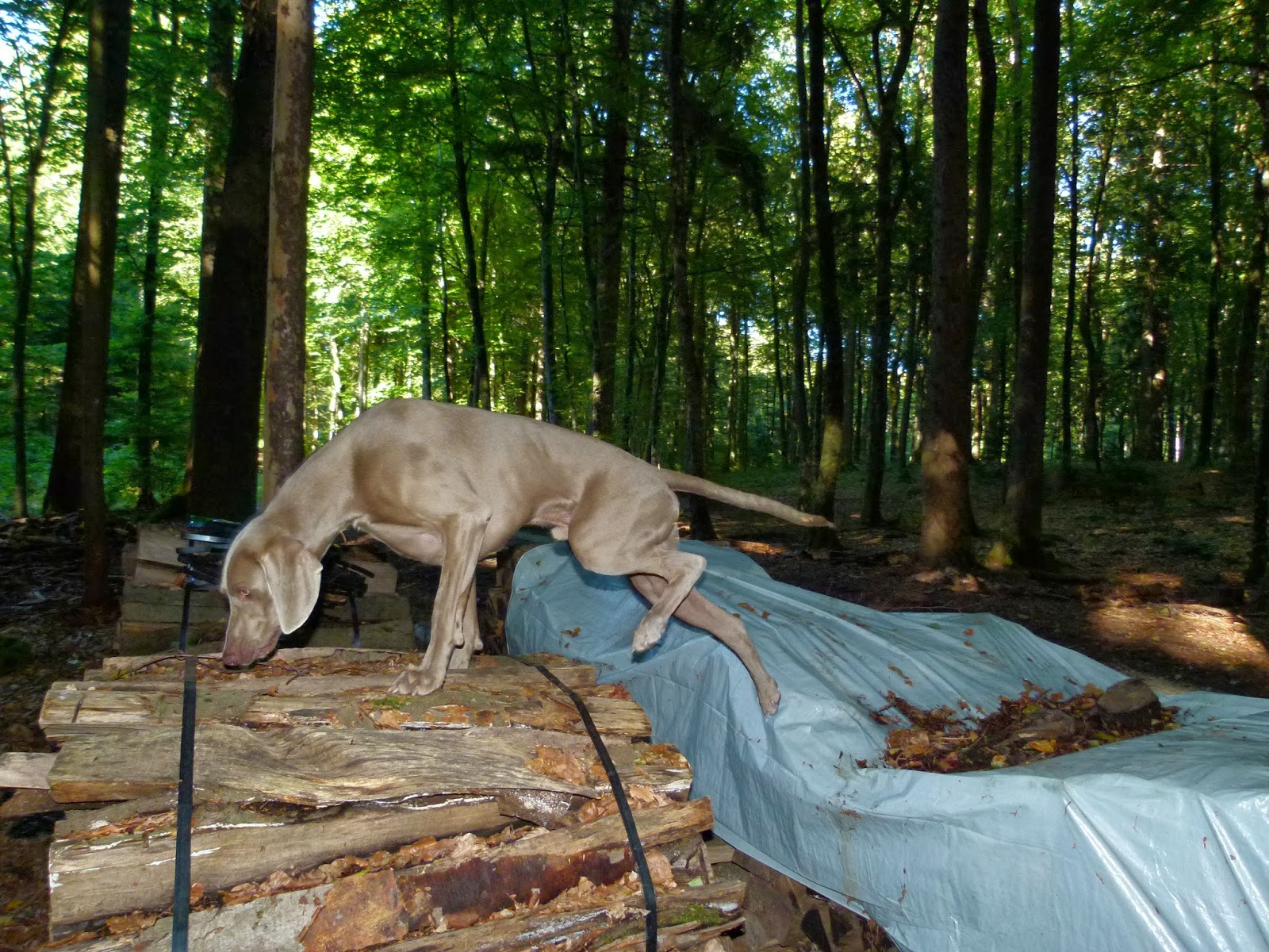 Nous avons ensuite pris vos chemins respectif pour entamer nos balades. Nous avons de suite croisse un couple de personne qui avait deux chiens. Ils ont tenu leur chien en laisse et au collier pour nous croisse. J’ai dit à mes 2 champions de laisser les chiens tranquille et de rester à mes pieds. Nous avons continué notre balade. Plus tard, j’ai eu la bonne idée de leur faire faire de l’Agility. Oh! miracle Silver a été le premier à monter sur le tas de bois. Aussi bizarre que ça peut l’être Nicky a cette fois eu des problèmes à effectuer cet exercice. Il a été motivé par Silver et, nous avons immortalisé ces exercices par les photos ci-dessous.