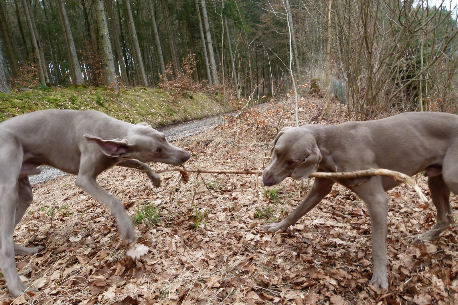 Hello! Ce matin, quelle matinée de chiens….. J’arrive vers 10h°° dans la forêt de Yens, j’avais parqué la voiture de Nicky et Silver (oui, oui, je suis leur chauffeur attitré) J’espère garder ma place assez longtemps… Enfin, je me prépare à démarrer ma promenade lorsque arrivent 2 véhicules dont un minibus au plaque Argovienne. Je me dit “Advienne que pourra” et, je continue mon chemin. Voila t’y pas qu’à 500m, les 2 véhicules sont parqués sur le côté du chemin. Apparemment, c’était un groupe de maîtres-chiens qui si préparait à un entraînement. (J’en ai eu la confirmation lorsque en fin de promenade, j’ai voulu traverser la forêt hors des sentiers battus) Je grogne un peu car, je dois reprendre mes chiens en laisse. Enfin, je passe le barrage et, je continu mon chemin avec mes 2 compagnons. Nous avons fait un grand tour à 99% sur du chemin carrossable. Tout, c’est passé super bien calmement sans, que Nicky et Silver cherche à partir à l’aventure. C’est un ballade toute relax, Nicky et Silver joue ensemble, ils font un peu de braque danse, ils se trouve des bout de bois à mâchouiller car, ils aiment prendre la vie par le – bon bout- de bois. Plus tard, Nicky se trouve une bonne galette de fumier, (Galette spéciale de Froideville) et, pour couronner le tout, par manque de dents, il se trouve un crane de (je suppose que c’est du sanglier) J’ai immortalisé le trophée dans ma boite à images. Tout en continuant notre ballade, un cycliste passe, plus tard, notre rencontrons une jeune femme accompagnement d’une autre jeune femme et d’un chien (GPS) Il avait un boîtier GPS car, je crois qu’il est Alzheimer. Enfin, après quelques minutes de pause, je décide de couper dans le bois (sans H) pour rejoindre la voiture, Je me trouve à 50m nez à nez avec le 1er groupe que j’avais croisée. Effectivement, un petit chien gueulait à tou va, un autre lui répondait, des voies s’y mettaient aussi, je me suis dit “La tranquillité des lieux est trop perturbée” J’ai rappelé Nicky et Silver (sans gueuler, car, un chien entends très très bien sans lui aboyer dessus) dans le calme le plus plat, je les ai repris en laisse et, j’ai contourné l’obstacle. Un peu plus tard, ont rencontre encore 2 dames avec des chiens Malinois – ou peut être Tervuren) Une des dames avait son chien détaché Nicky et Silver étaient aussi détaché. J’ai rappelé mes 2 amis (sans stress, sans élever la voie, calmement) pendant que madame s’égosillait à rappeler son chien. Enfin, plus tard, je m’arrête pour lever la patte et, je rappel Nicky afin qu’il se mette sur le tas de bois afin de mieux me cacher. Nous croissons encore 2 gros véhicules, je garde toujours sous contrôle mes 2 amis. Avec toutes ces surprises car, en semaine, il n’y a pratiquement personne, je doit dire que mes 2 loulous ont vraiment été SUPER. C’EST VRAIMENT DES PERLES GRISES. COMME VOUS LE SAVEZ LES PERLES GRISES SON TRÈS RARES ET, C’EST VRAIMENT LE CAS POUR NICKY ET SILVER C’EST QUE DU BONHEUR……