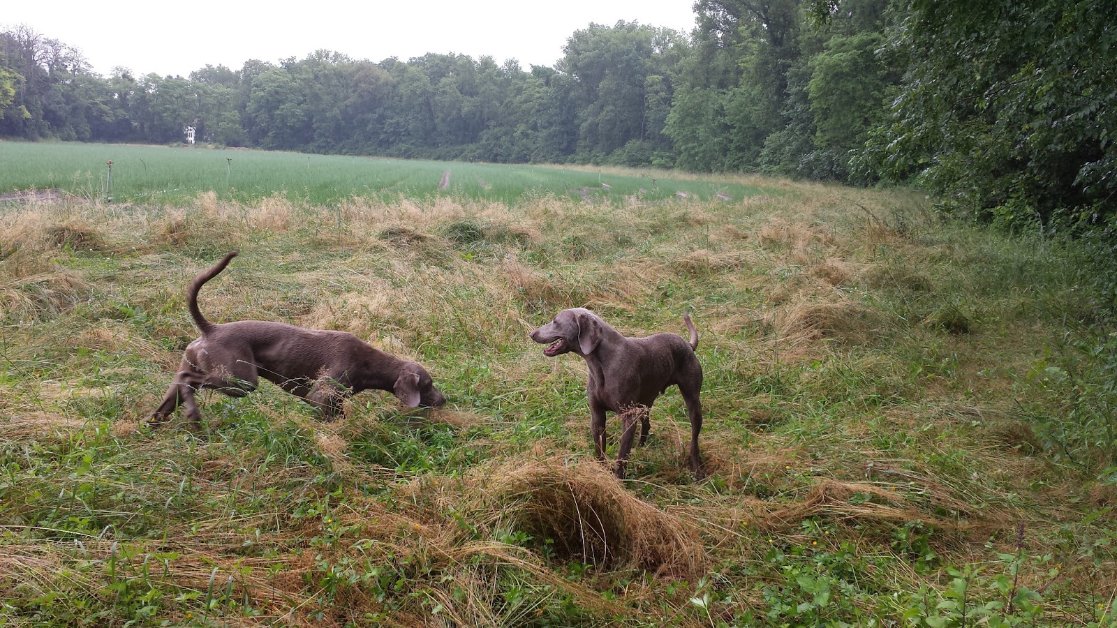 Cet après-midi après une bonne sieste, nous sommes reparti en ballade mais, cette fois si dans la campagne environnante. je n’avait pas envie de prendre la voiture. La ballade a durée plus de 2 heures. Nous avons rencontré un vigneron qui s’occupait de sa vigne et pendant 5 minutes nous avons blablaté. Les chiens sont restés bien sage et, n’étaient pas trop impatient d’aller gambader. Ce la a fait leur a fait un très bon exercice de sociabilisation. Ce vigneron a aussi un chien Spanel noir et blanc de 4 ans et, il le prends à la chasse. Je lui ai montré mon lâché de chiens. Il consiste à les faire assoir, je leur donne l’ordre de “Reste” ensuite je décroche les laisses. Je leur donne toujours l’ordre *Reste” et, je les fait attendre durant 30 sec. C’est très amusant de les voir presque sur des startings blocks. et, ça me fait rire. Ensuite, je leur donne l’ordre un peu claquant: “Libre” en 30 sec ils ont déjà fait 100 m. Enfin, on a fait une grande ballade sans faire de rencontre. Nicky et Silver étaient branchés rongeurs et de temps en temps oiseaux.