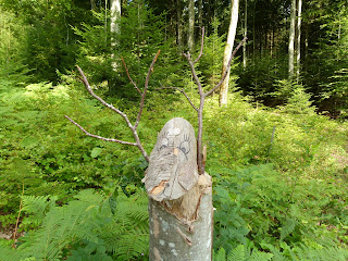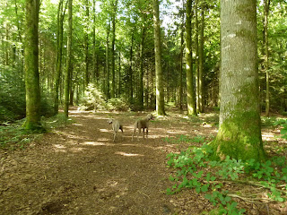 Il y avait de gros nuages et le tonnerre grondait ( ou grognait) J’ai hésité à aller faire la promenade du côté d’Apples et, finalement parce que c’était tellement noir de nuage que j’ai opté pour la forêt de Yens. A notre arrivée, il n’y avait personne. Plus tard, nous avons rencontré une dame avec deux grands chiens très poilus (genre Briard mais, avec les oreilles tombantes) La pauvre dame a galèré pour tenir ces 2 chiens en laisse lorsqu’on l’a croisé. Les bras de la petite dame se sont rallongés de 10 cm. Mes 2 champions “noouissaient” pour aller dire “Bonjour” à ces 2 chiens mais, comme ont dit “Chiens en laisse = continue ton chemin avec tes chiens en liberté”