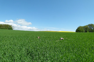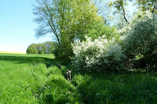 Cet après-midi, la promenade a été effectuée en dessous de notre niche. Il y a de la campagne et une forêt. Un ruisseau appelé le Boiron coule dans cet endroit. Nous sommes descendus un champ en jachère qui fait bien 80 m de large sur une longueur de 300 m. Nicky et Silver ont effectué des courses sans fin durant toute la descente. Ensuite, nous avons traversé le bois pour arriver sur le versant Sud. Un chemin longe la forêt à notre droite et, à notre gauche il y a des champs et, ensuite l’autoroute A1. Lorsque l’ont marchaient dans la direction St.-Prex, nous avons rencontré une jeune cavalière. Son cheval de 4 ans était superbe. Je ne me suis pas gêner pour lui demander de caresser son beau cheval et de lui demander de quel race il était. Elle m’a dit que c’était un Comtois mélanger avec un Peeache américain. Enfin, se cheval était de couleur brun foncé avec une petite étoile sur le front. Sa crinière était de couleur crème-or et sa queue qui descendait jusque parterre était de la même couleur. Pendant l’échange de mes quelques mots et les caresses au cheval mes 2 loulous sont resté prés de nous sans aucun problème. Nous avons repris notre chemin et, un peu plus tard mademoiselle et son joli cheval sont repassé. Nous avons continué tranquillement notre ballade. C’est la seule rencontre que nous avons eu lors de notre parcourt. Enfin au retour de la promenade, lorsque je suis arrivé au dessus du champ en jachère, j’ai vu une dame qui était debout, son casque à vélo et quelques affaires parterre. Elle était à côté d’un champ fleuri de colza. Pour Silver, pas de problème, il s’est approché de cette personne sans problème. Par contre Nicky n’était pas à l’aise et, il s’est mis à aboyer mais, juste un petit peu. Avec mon assistance mais sans forcer, ill s’est approchée de madame et a été rassuré. Nous avons échangé quelques mots et pendant ce temps mes 2 loulous sont parti dans le champ de colza. Tout à coup, une voiture arrive -il y a très peu de trafic- et, oh surprise! c’est madame Colombo…. Il a fallu quelle passe à ce moment là mais, ça a été, elle ne m’a pas réprimandée mais, tout à coup les chiens sont revenus par cette route et là, panique. Elle me dit: “Les chiens sont sur la route” J’ai essayé de les ramener à la voix à moi mais, ils insistaient pour rester vers sa nouvelle voiture quelle a depuis une petite semaine. Enfin, j’ai repris la situation en main et, je suis rentré à la maison avec mes amis. Madame Colombo a placé sa voiture de côté et fait causette avec Madame Vélo car, le hasard fait que ces dames se connaissent professionnellement.